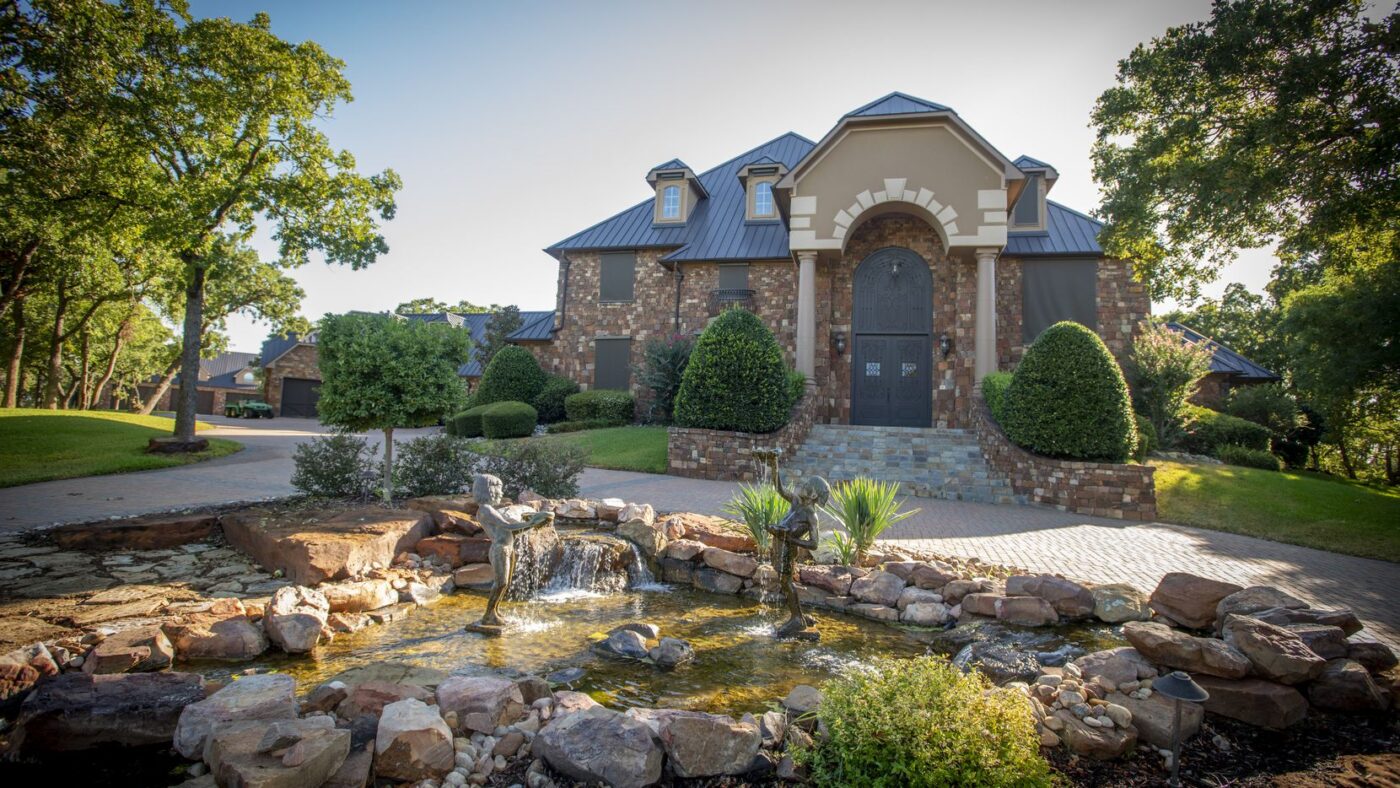 The Flower Mound home with two garages also includes a fishing pond, a baseball field and a volleyball court.