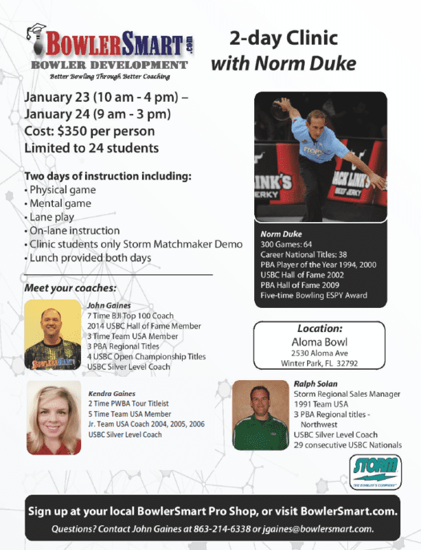 Improve your bowling game at the BowlerSmart Norm Duke 2 Day Bowling Clinic. Space is [...]