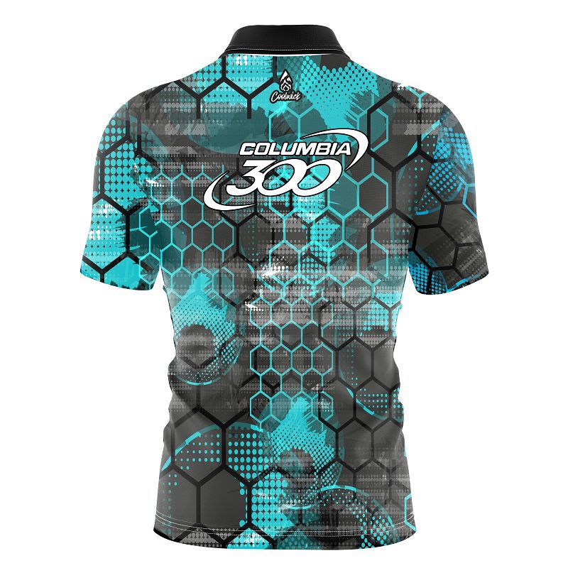 Columbia 300 Teal Honeycomb Quick Ship CoolWick Sash Zip Bowling Jersey