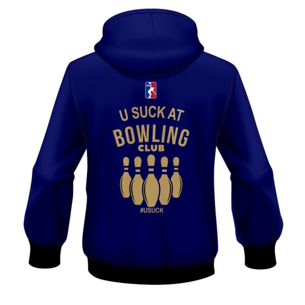 Drink beer, eat wings and pizza, throw a 7 count and repeat! We know how to have fun while sucking at bowling on league night, hell we are league bowlers ourselves who understand why you are there…..It is a handicap league so work on building your handicap while looking good in the 1 Handed #USuck@Bowling Navy Retro Official League Bowling Hoodie….Beer and wings sold separately.