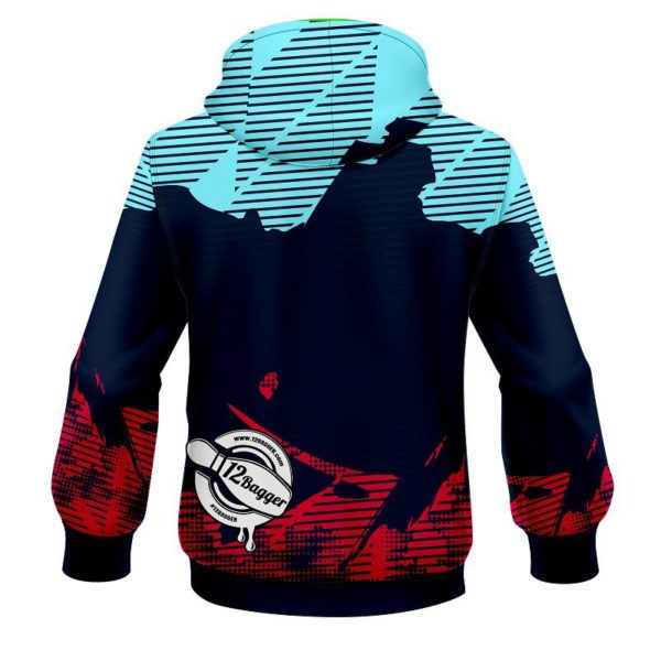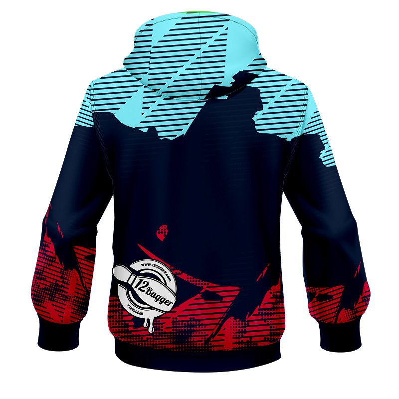 Look fresh and stay warm in the new 12Bagger Bowling Strikers Jagged Blue and Pink Coolwick Dye-Sub Hoodie.