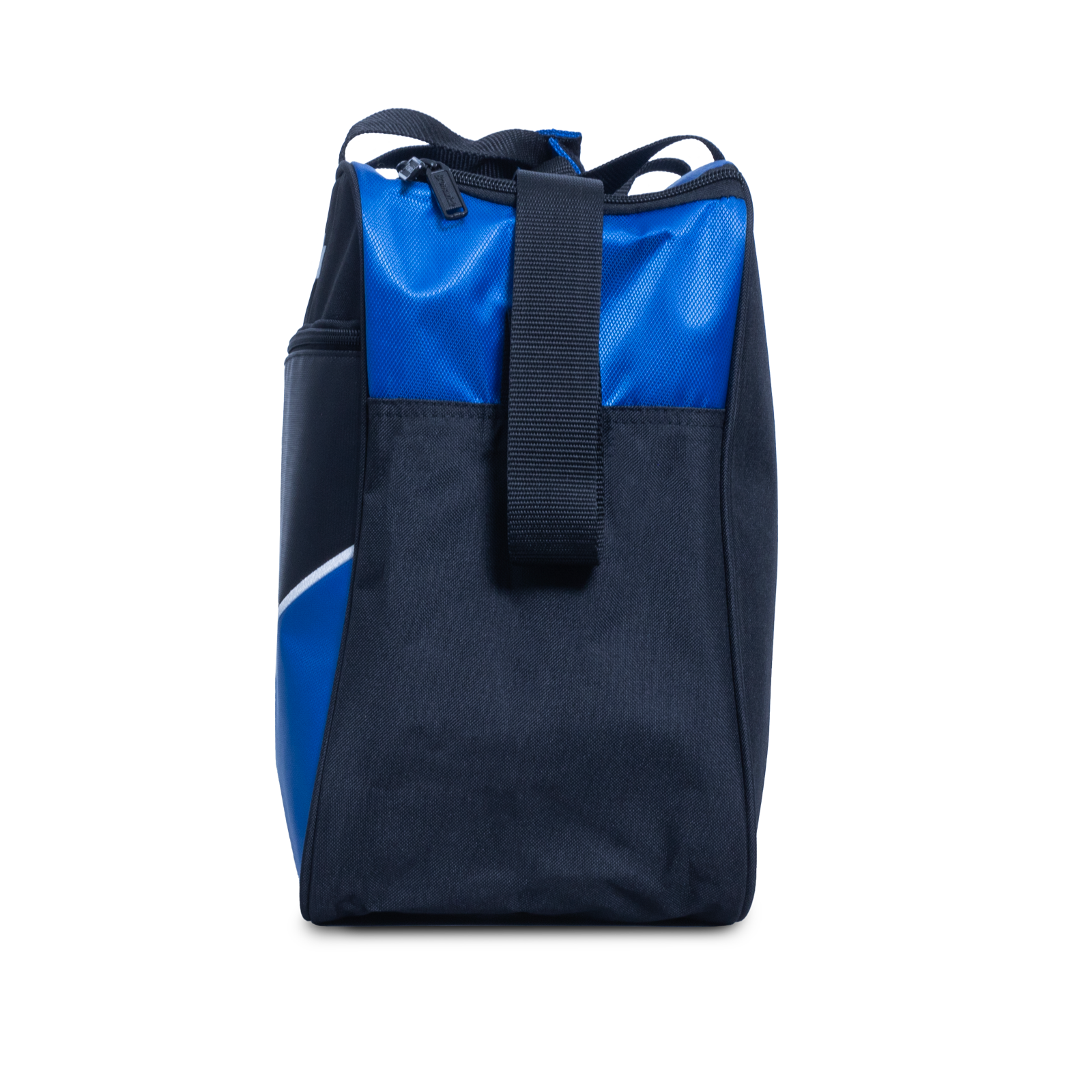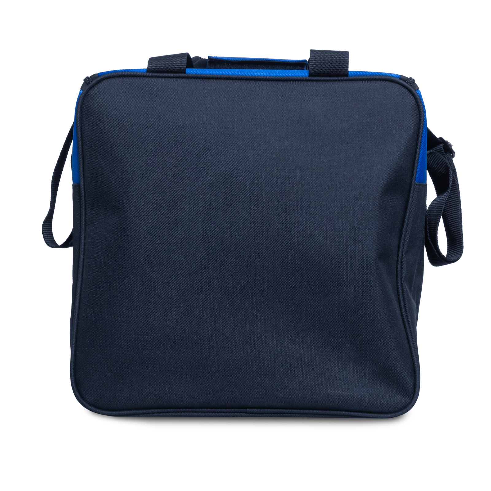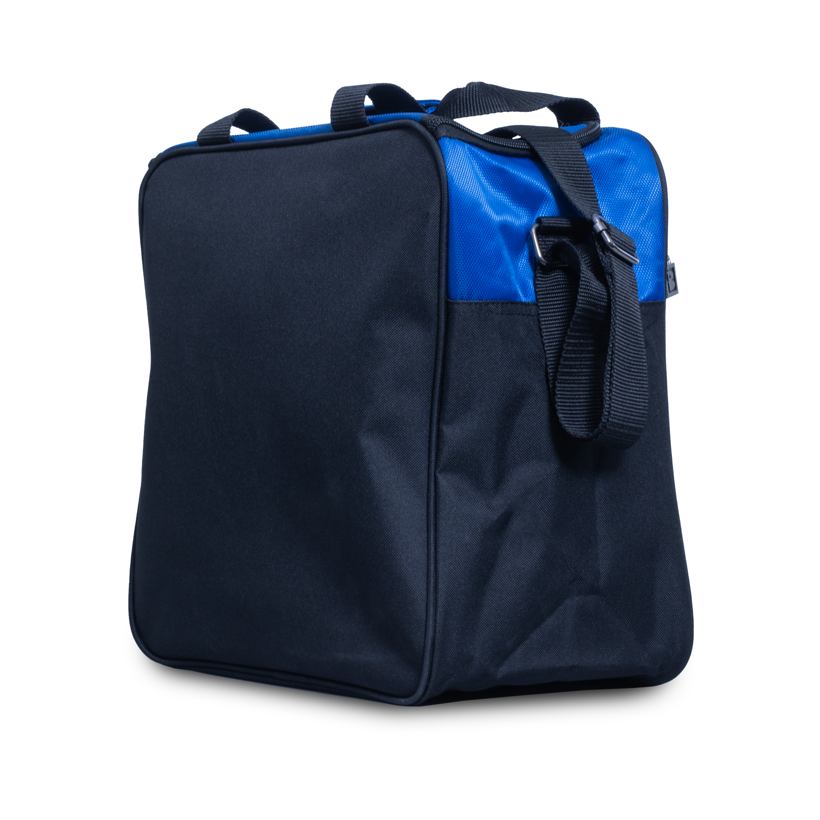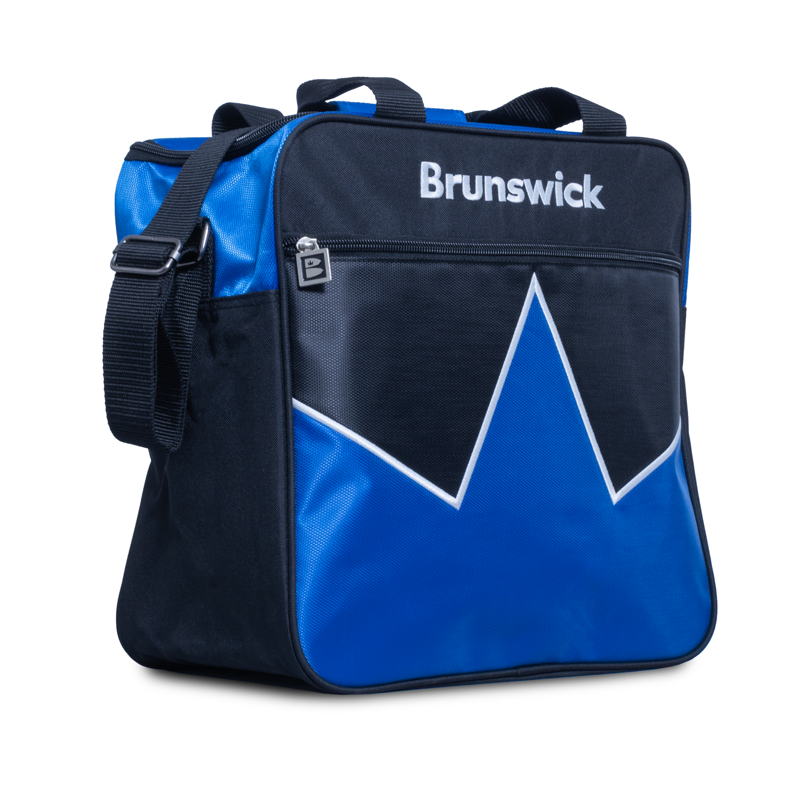 Brunswick Blast Blue single tote โ one ball capacity with shoe and accessory compartments. Adjustable strap.