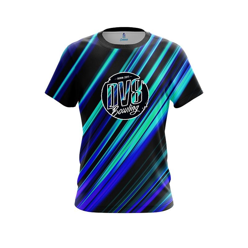 Stay 40% Cooler with the DV8 Blue And Green Digital Stripe CoolWick Bowling Jersey