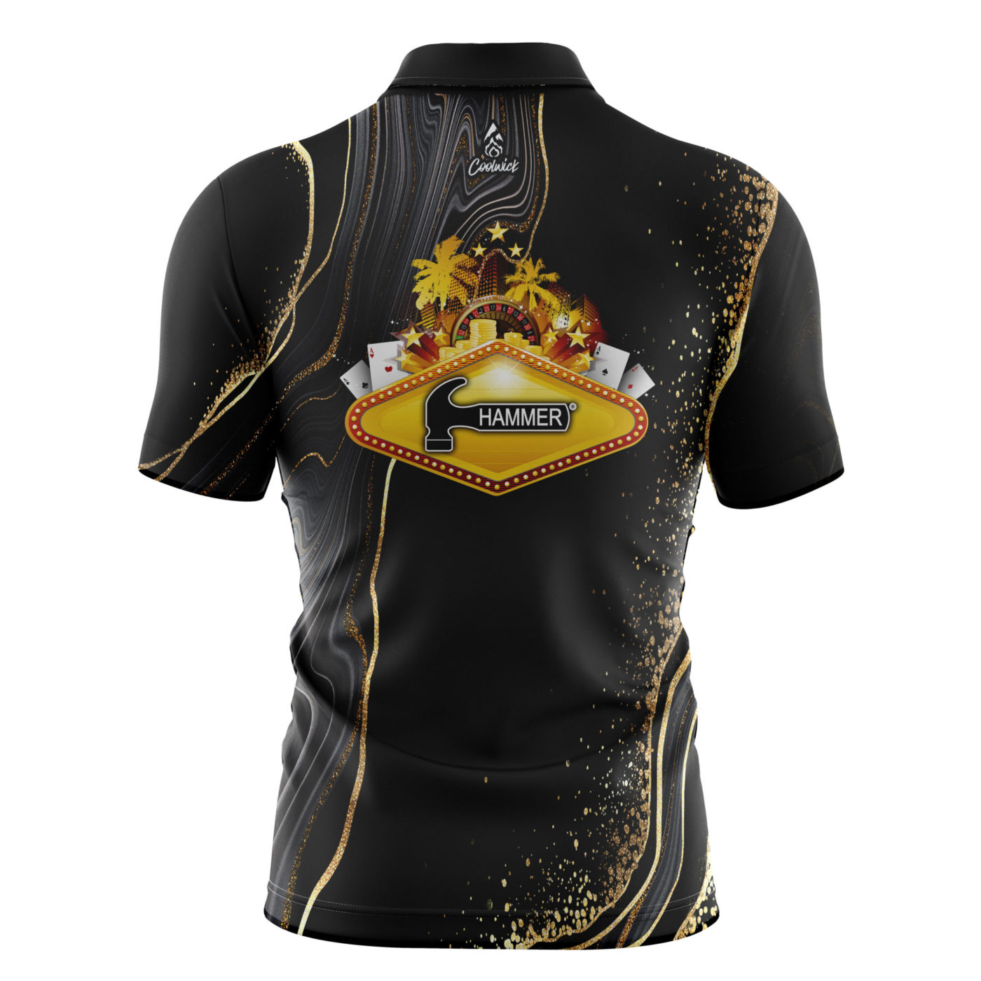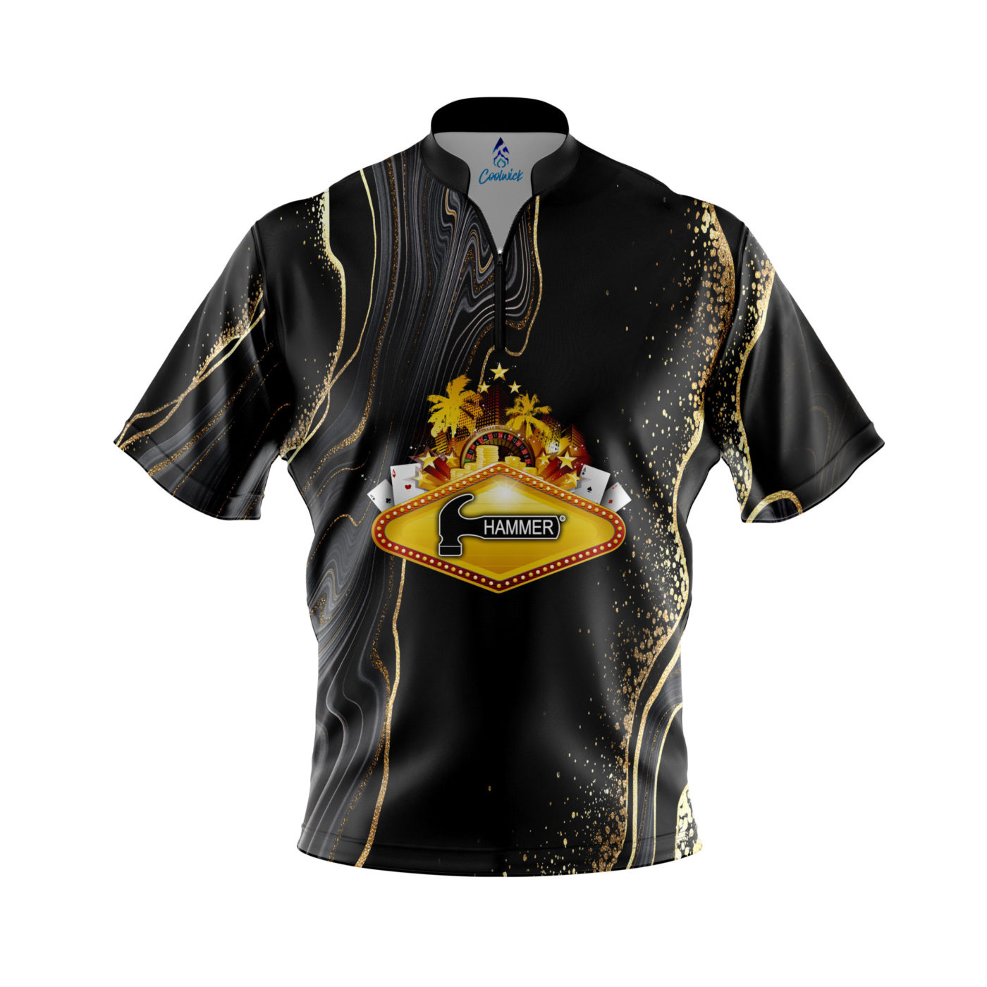 Stay 40% cooler with CoolWick. Our Hammer Vegas 2022 Quick Ship CoolWick Sash Zip Bowling Jerseys are made of CoolWick technology fabric that helps wick moisture away and helps the air flow more easily through the fibers.
