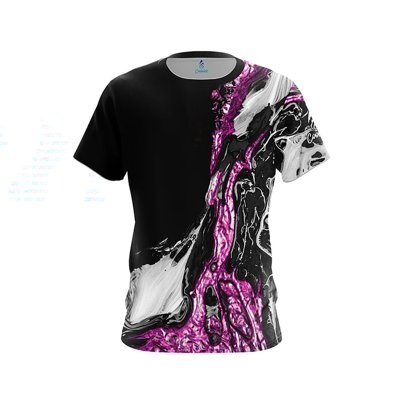 Pink Black Liquid Marble semi-custom bowling jersey built with CoolWick’s 40% cooler moisture-wicking fabric. Add your name on back, choose your sleeve length, and place logos on the chest and sleeves. Hand-made in the USA. Free shipping.