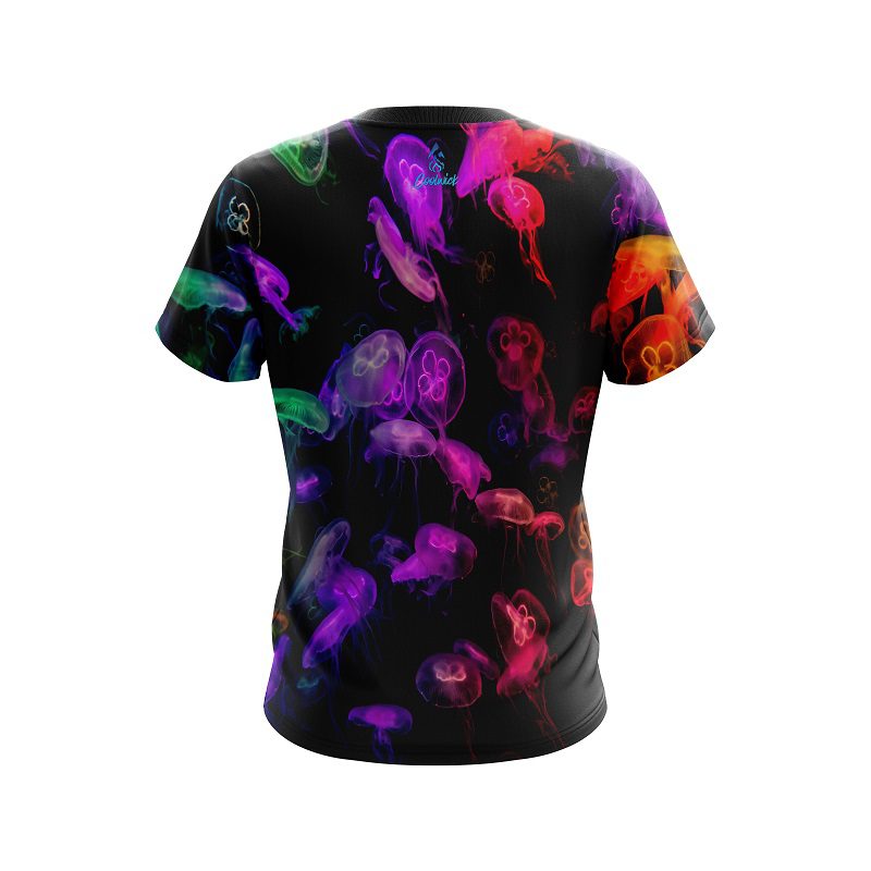 Stay 40% cooler with CoolWick. Our Plain Glowing Jellyfish CoolWick Bowling Jerseys are made of two different fabrics with the back being our CoolWick technology fabric that helps wick moisture away and helps air flow more easily through the fibers
