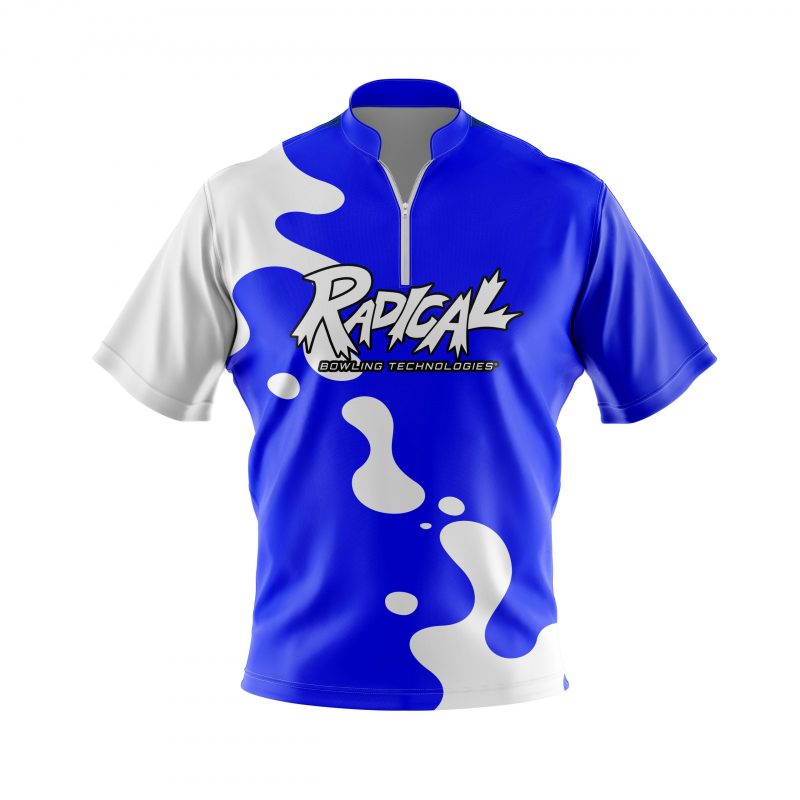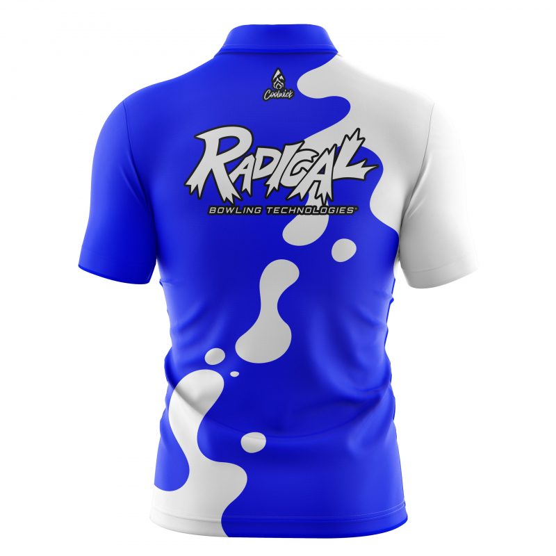 Stay 40% cooler with CoolWick. Our Radical Blue White Drip Quick Ship CoolWick Sash Zip Bowling Jerseys are made of CoolWick technology fabric that helps wick moisture away and helps air flow more easily through the fibers.