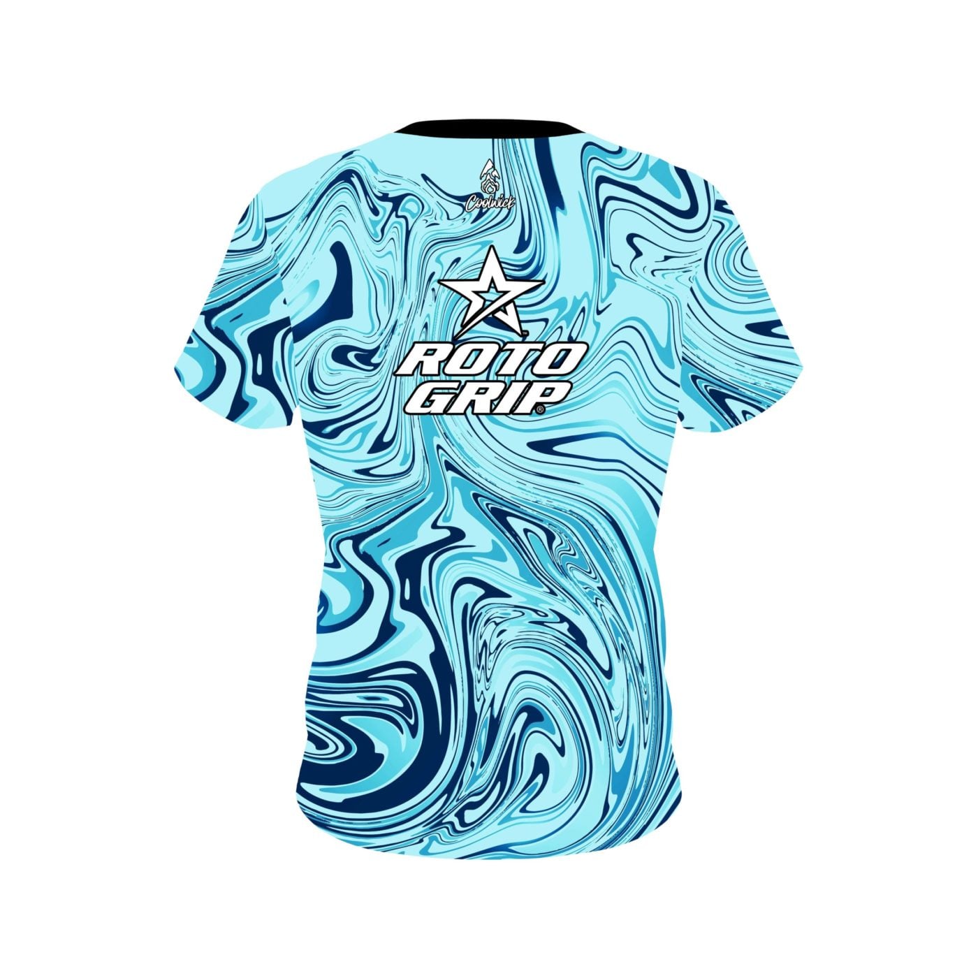 Roto Grip Blue Hallucinate semi-custom bowling jersey in CoolWick’s 40% cooler moisture-wicking fabric. Add your name on back, choose your sleeve length and collar style, and place logos on the chest and sleeves. Hand-made in the USA. Free shipping.