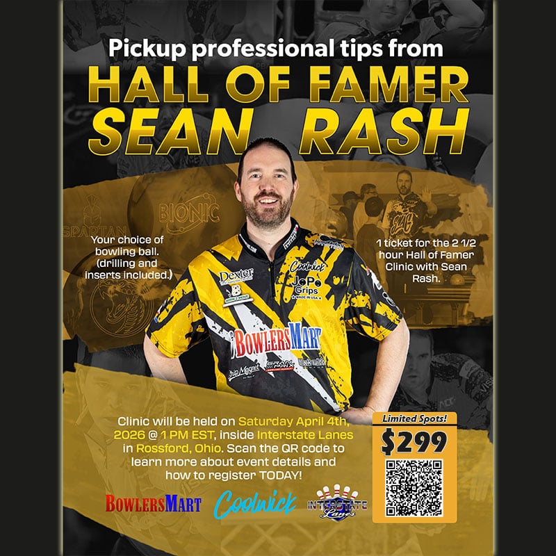 Get 2.5 hours of personalized coaching from PBA and USBC Hall of Famer Sean Rash at Interstate Lanes in Rossford, OH on April 4th at 1:00 PM. Limited to 20 participants. Includes a FREE performance bowling ball of your choice, professionally fitted with inserts and slug.