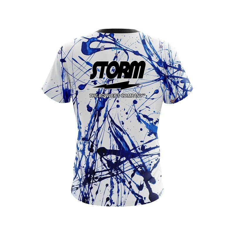 Storm Blue Paint Splash semi-custom bowling jersey in CoolWick’s 40% cooler moisture-wicking fabric. Add your name on back, choose your sleeve length and collar style, and place logos on the chest and sleeves. Hand-made in the USA. Free shipping.