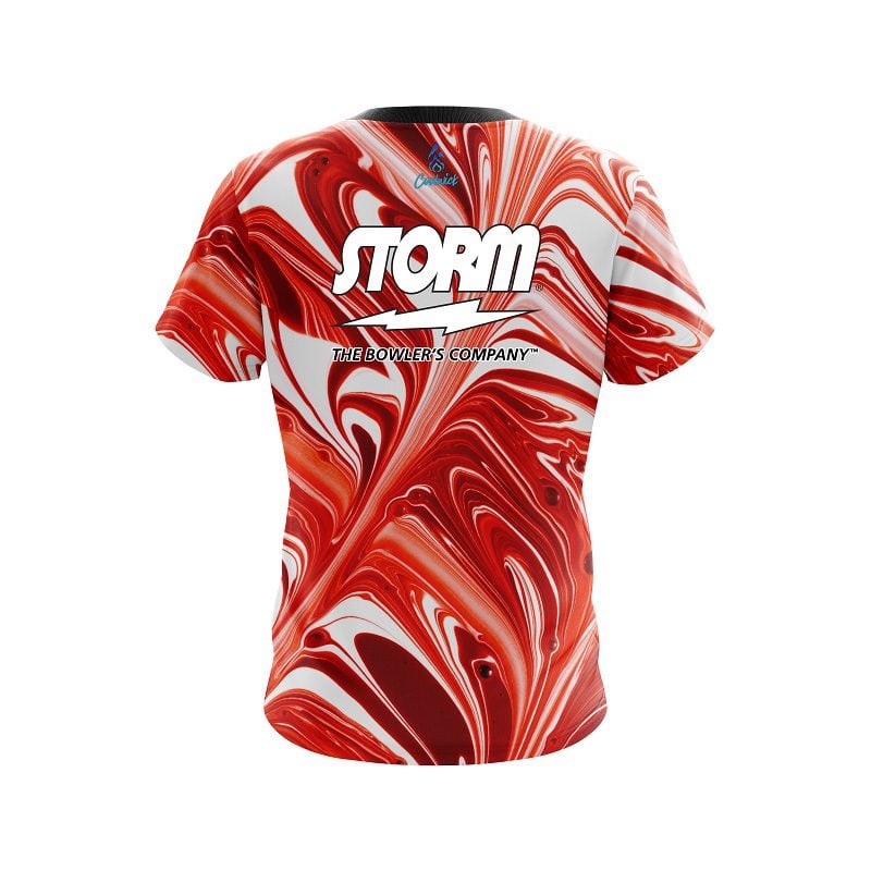 Storm Deep Red And White Liquid Swirls semi-custom bowling jersey in CoolWick’s 40% cooler moisture-wicking fabric. Add your name on back, choose your sleeve length and collar style, and place logos on the chest and sleeves. Hand-made in the USA. Free shipping.