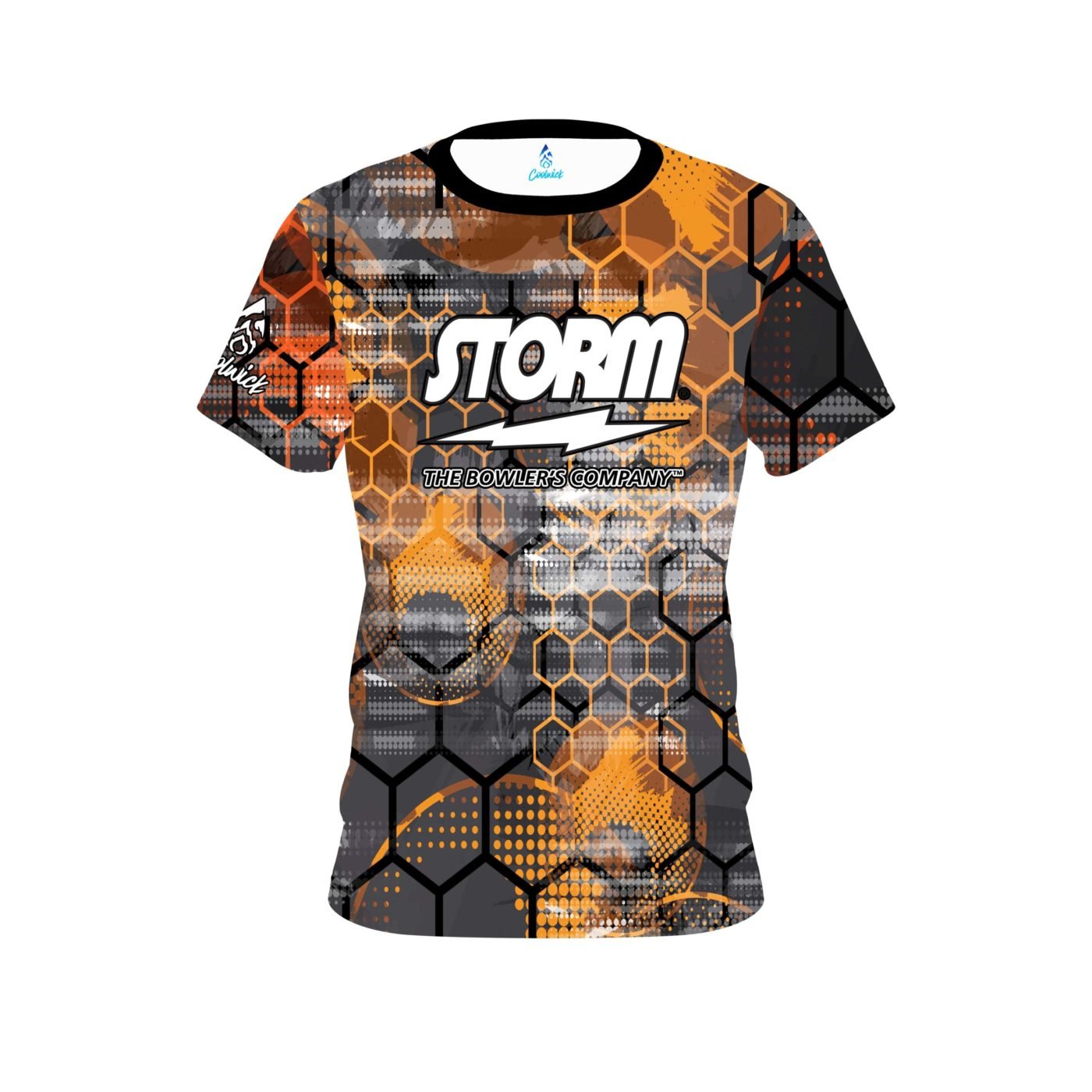Storm Fire Honeycomb semi-custom bowling jersey in CoolWick’s 40% cooler moisture-wicking fabric. Add your name on back, choose your sleeve length and collar style, and place logos on the chest and sleeves. Hand-made in the USA. Free shipping.