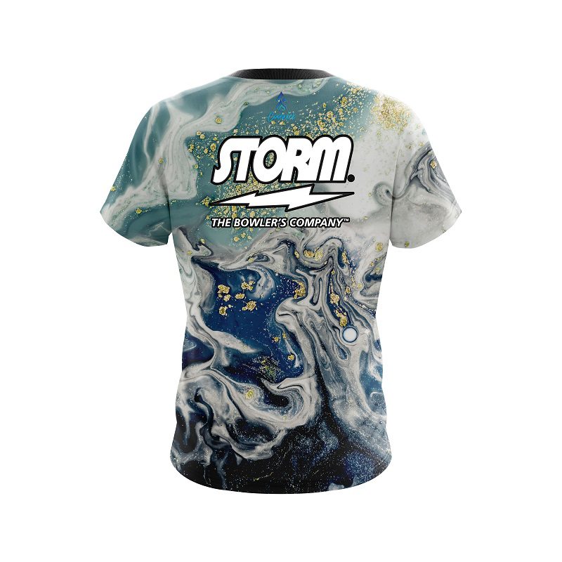 Storm Marbleized Ripple Pattern semi-custom bowling jersey in CoolWick’s 40% cooler moisture-wicking fabric. Add your name on back, choose your sleeve length and collar style, and place logos on the chest and sleeves. Hand-made in the USA. Free shipping.