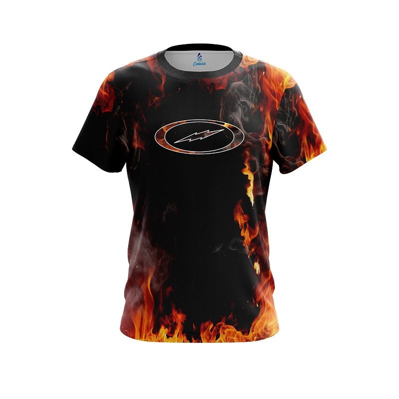Storm Oval Firebolt semi-custom bowling jersey in CoolWick’s 40% cooler moisture-wicking fabric. Add your name on back, choose your sleeve length and collar style, and place logos on the chest and sleeves. Hand-made in the USA. Free shipping.