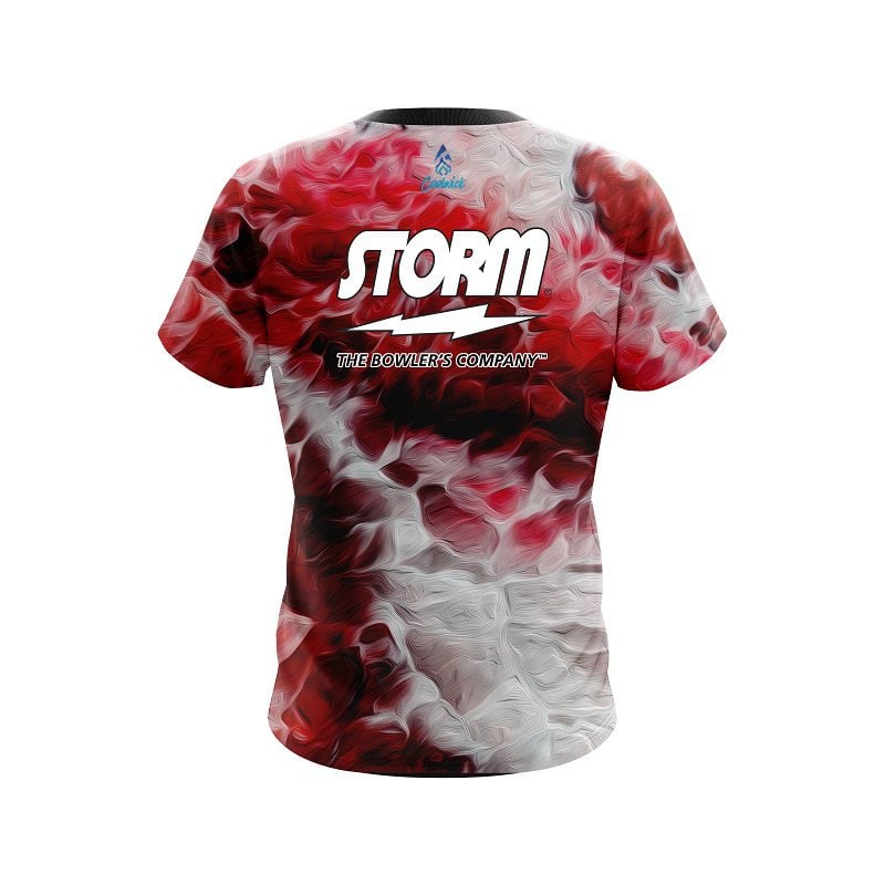 Storm Red Marble Onyx semi-custom bowling jersey in CoolWick’s 40% cooler moisture-wicking fabric. Add your name on back, choose your sleeve length and collar style, and place logos on the chest and sleeves. Hand-made in the USA. Free shipping.