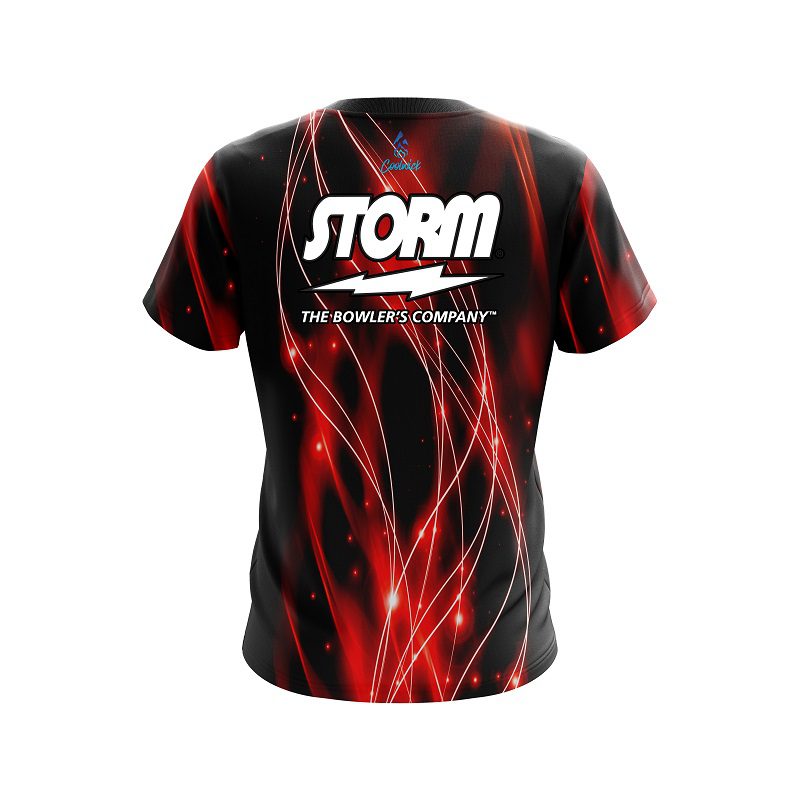 Storm Red Spiral Waves semi-custom bowling jersey in CoolWick’s 40% cooler moisture-wicking fabric. Add your name on back, choose your sleeve length and collar style, and place logos on the chest and sleeves. Hand-made in the USA. Free shipping.