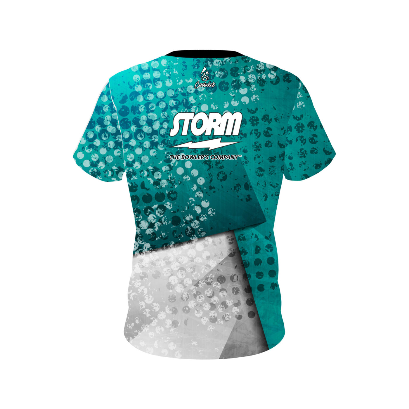 Storm Teal Grungey semi-custom bowling jersey in CoolWick’s 40% cooler moisture-wicking fabric. Add your name on back, choose your sleeve length and collar style, and place logos on the chest and sleeves. Hand-made in the USA. Free shipping.