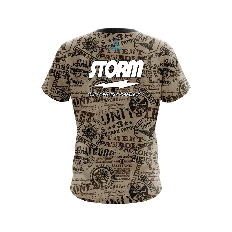 Storm Urban Military Grunge semi-custom bowling jersey in CoolWick’s 40% cooler moisture-wicking fabric. Add your name on back, choose your sleeve length and collar style, and place logos on the chest and sleeves. Hand-made in the USA. Free shipping.